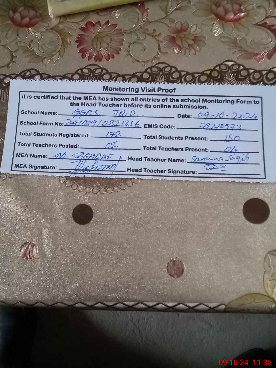 | Certified that this School was Inspected by the Undersigned MEA/DMO Today and the Information Stated Above is as Per Record. | |||||