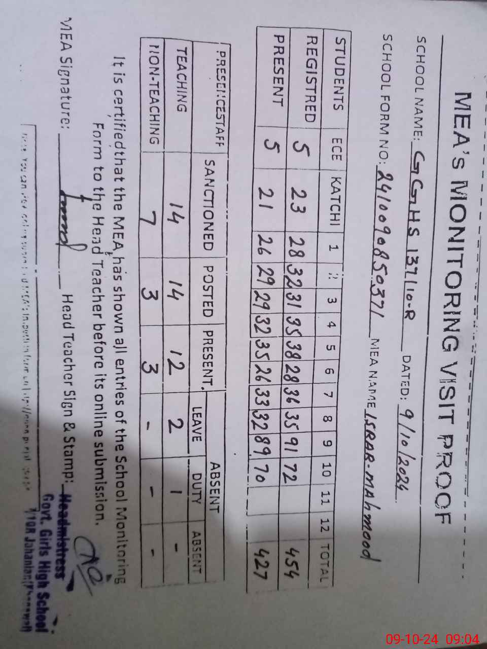 | Attendance Register | Head Teacher | MEA with School | Visit Proof |