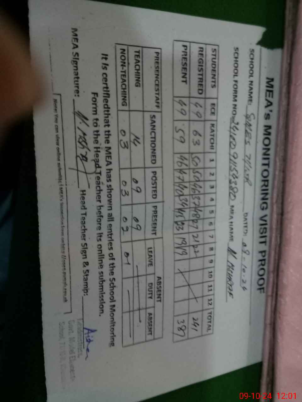 | Attendance Register | Head Teacher | MEA with School | Visit Proof |