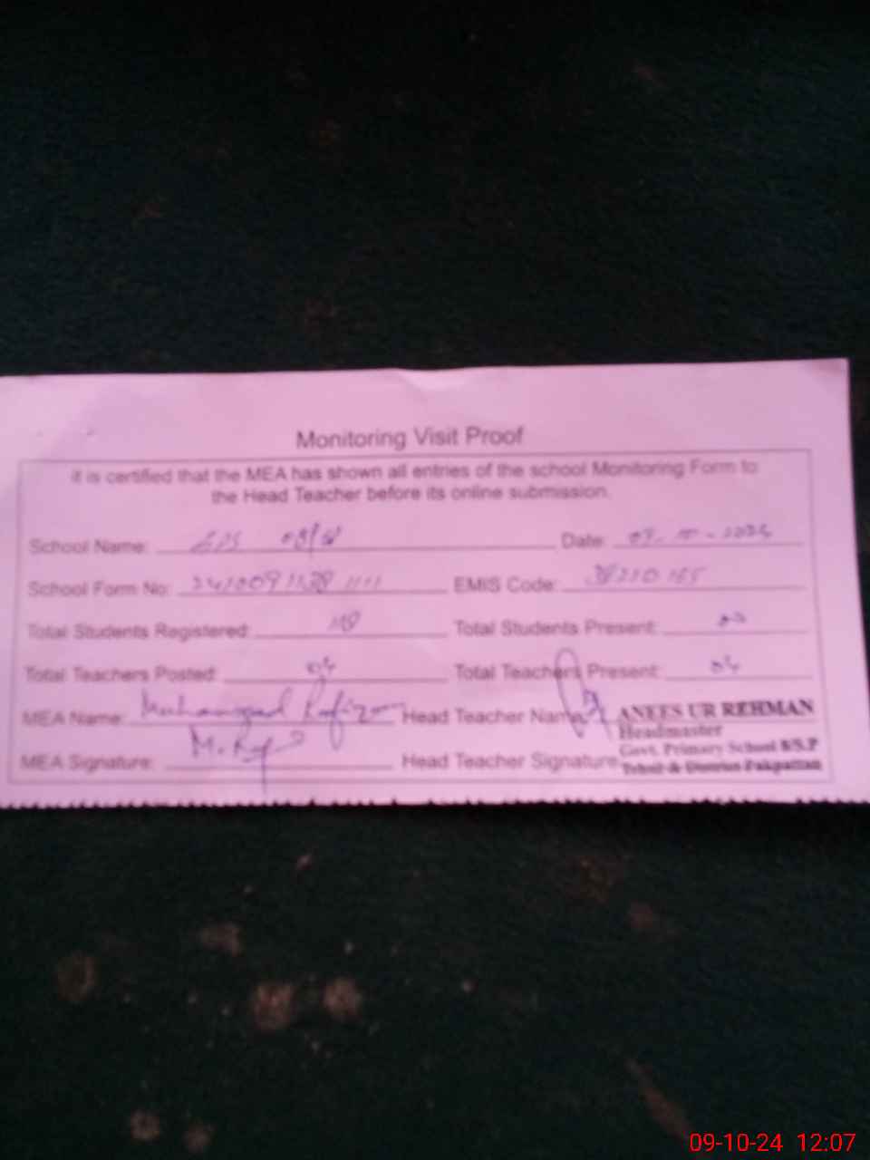 | Certified that this School was Inspected by the Undersigned MEA/DMO Today and the Information Stated Above is as Per Record. | |||||