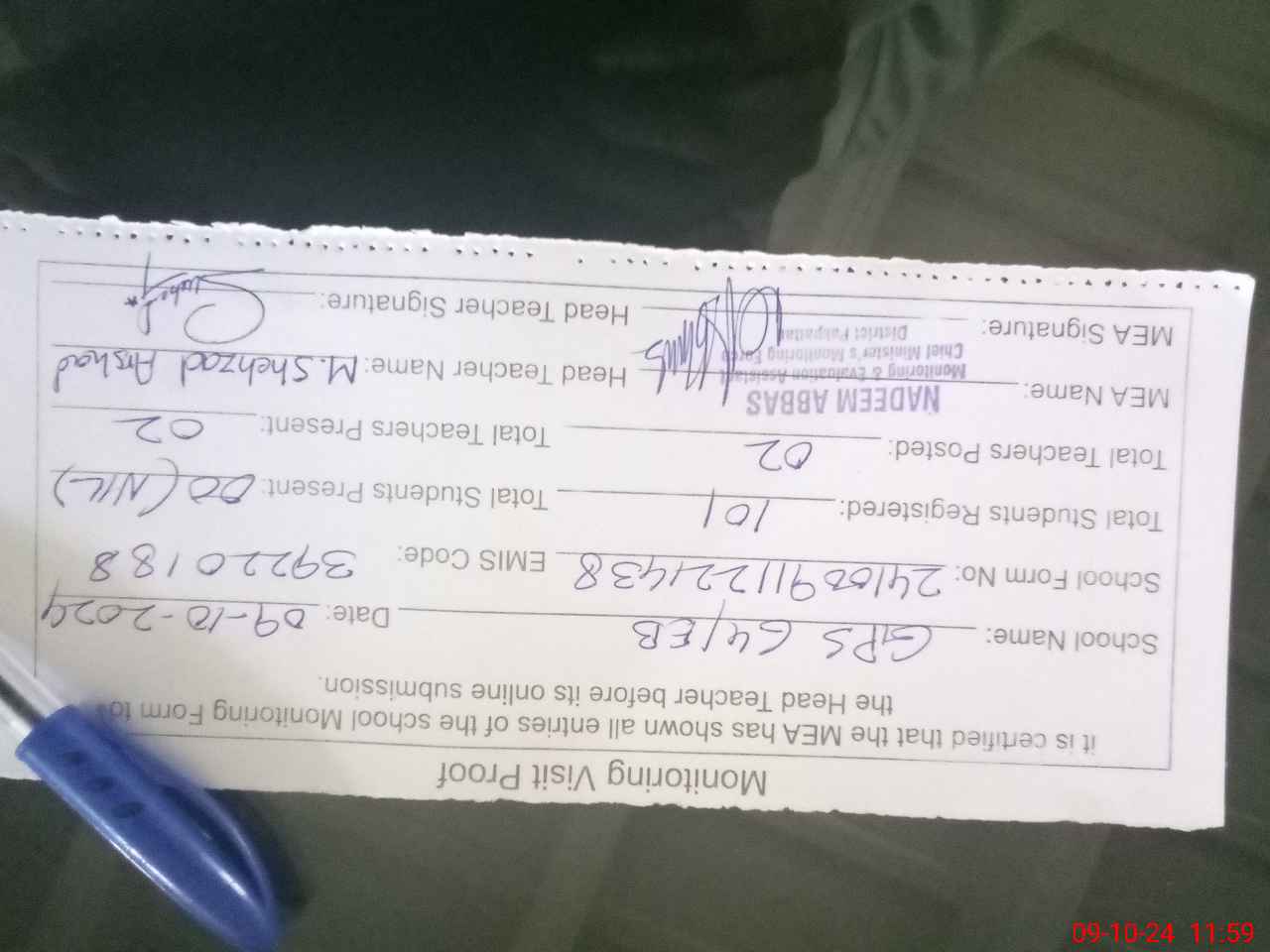 | Monitoring Date: 09-10-2024 | Start Time: 09-10-2024 11:22 AM | End Time: 09-10-2024 11:59 AM | Name of MEA: NA**** AB**** | |
