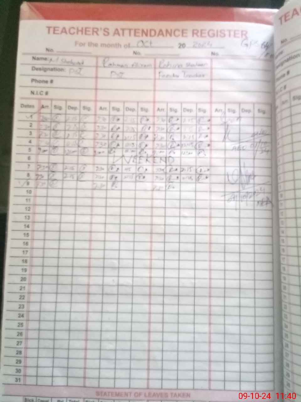 | CNIC | Full Name | Designation | R/C | Absence During Last Calender Month |
