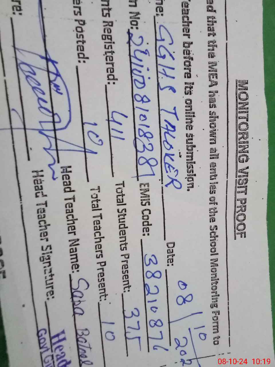 | EMIS Code: 38210876 | Name of School: GGHS TALOKAR | |||