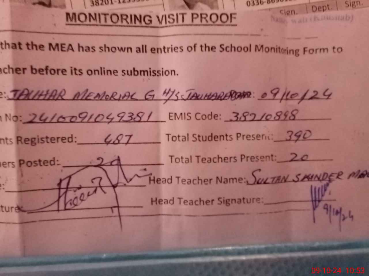 | Attendance Register | Head Teacher | MEA with School | Visit Proof |