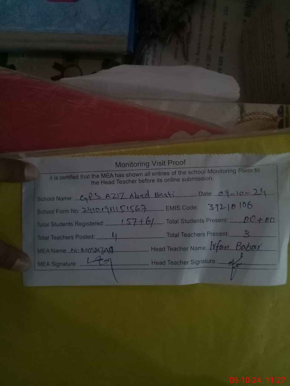 | Attendance Register | Head Teacher | MEA with School | Visit Proof |