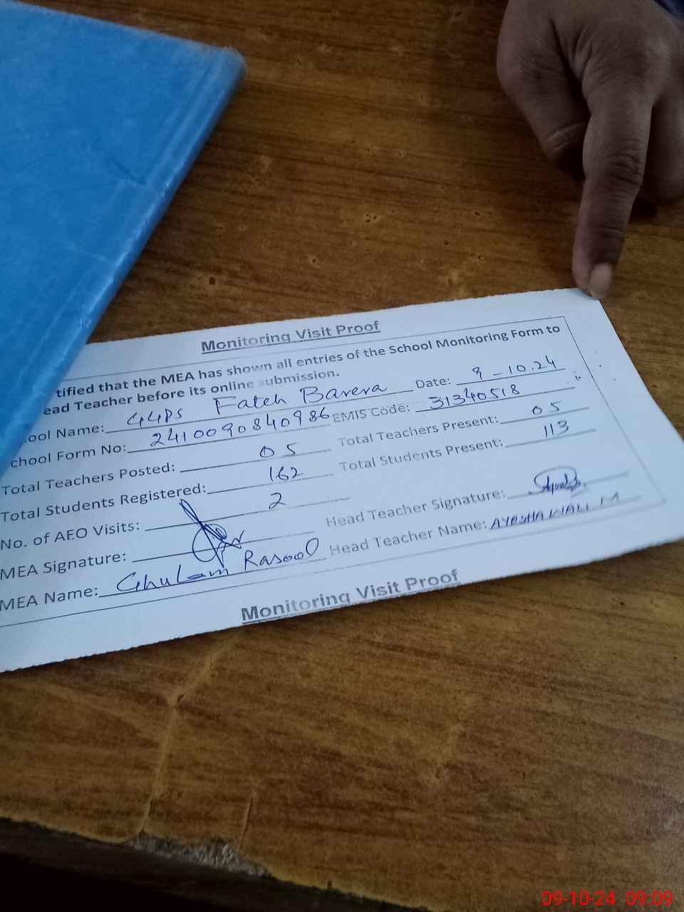 | Attendance Register | Head Teacher | MEA with School | Visit Proof |