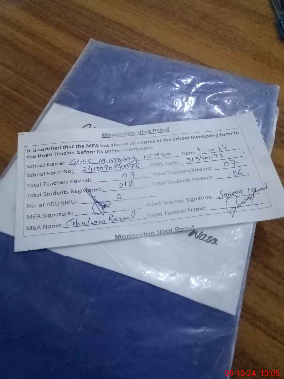 | Attendance Register | Head Teacher | MEA with School | Visit Proof |