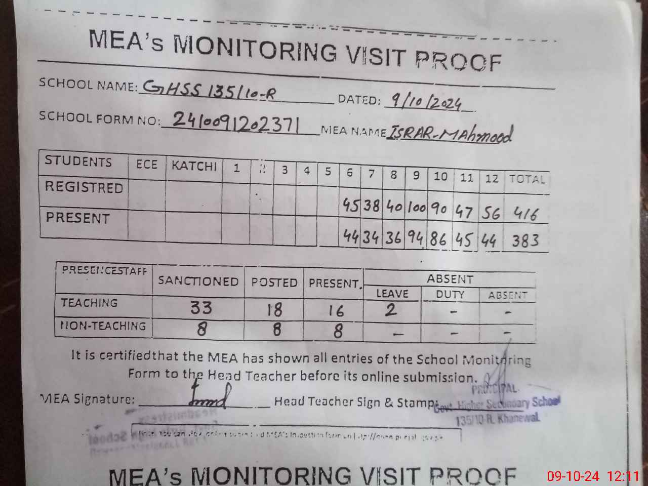 | Attendance Register | Head Teacher | MEA with School | Visit Proof |