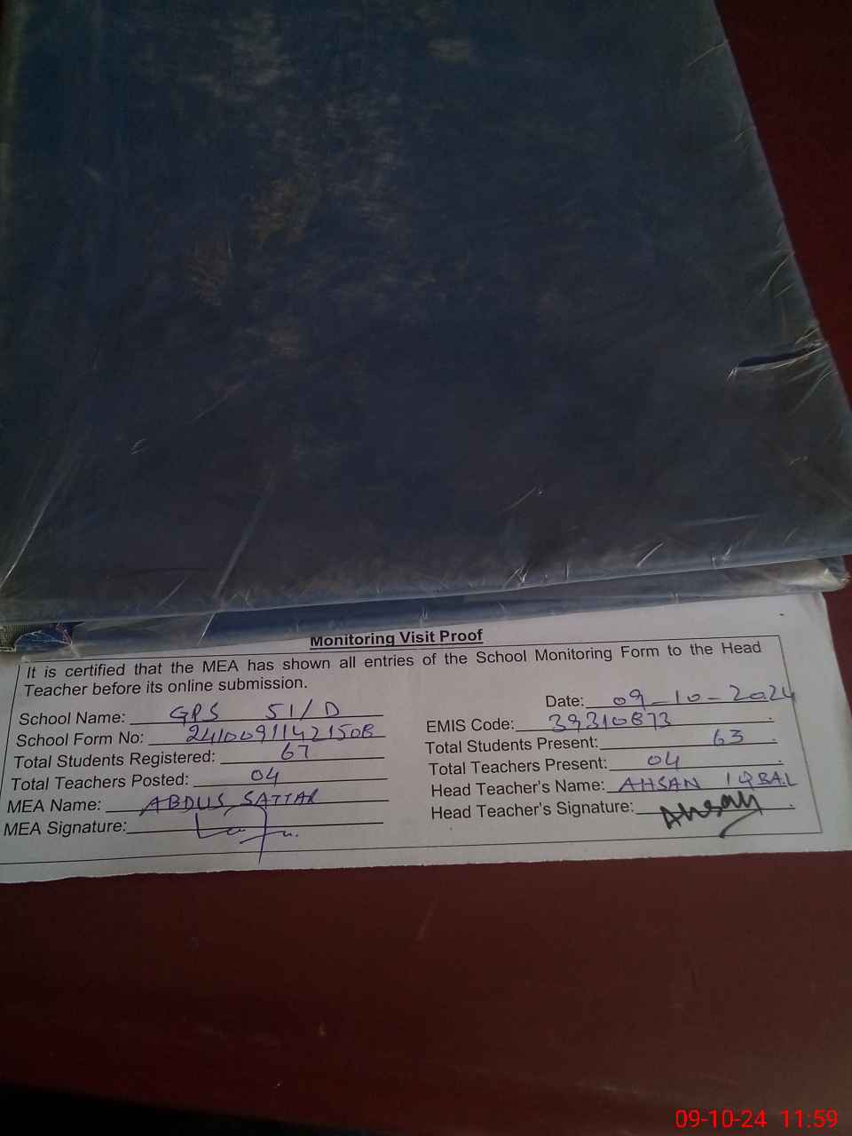 | EMIS Code: 39310873 | Name of School: GPS CHAK NO. 51-D | |||