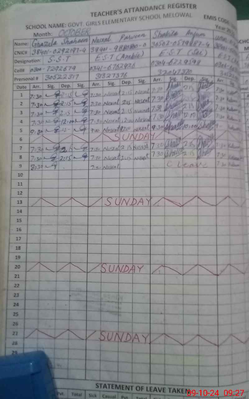 | CNIC | Full Name | Designation | R/C | Absence During Last Calender Month |