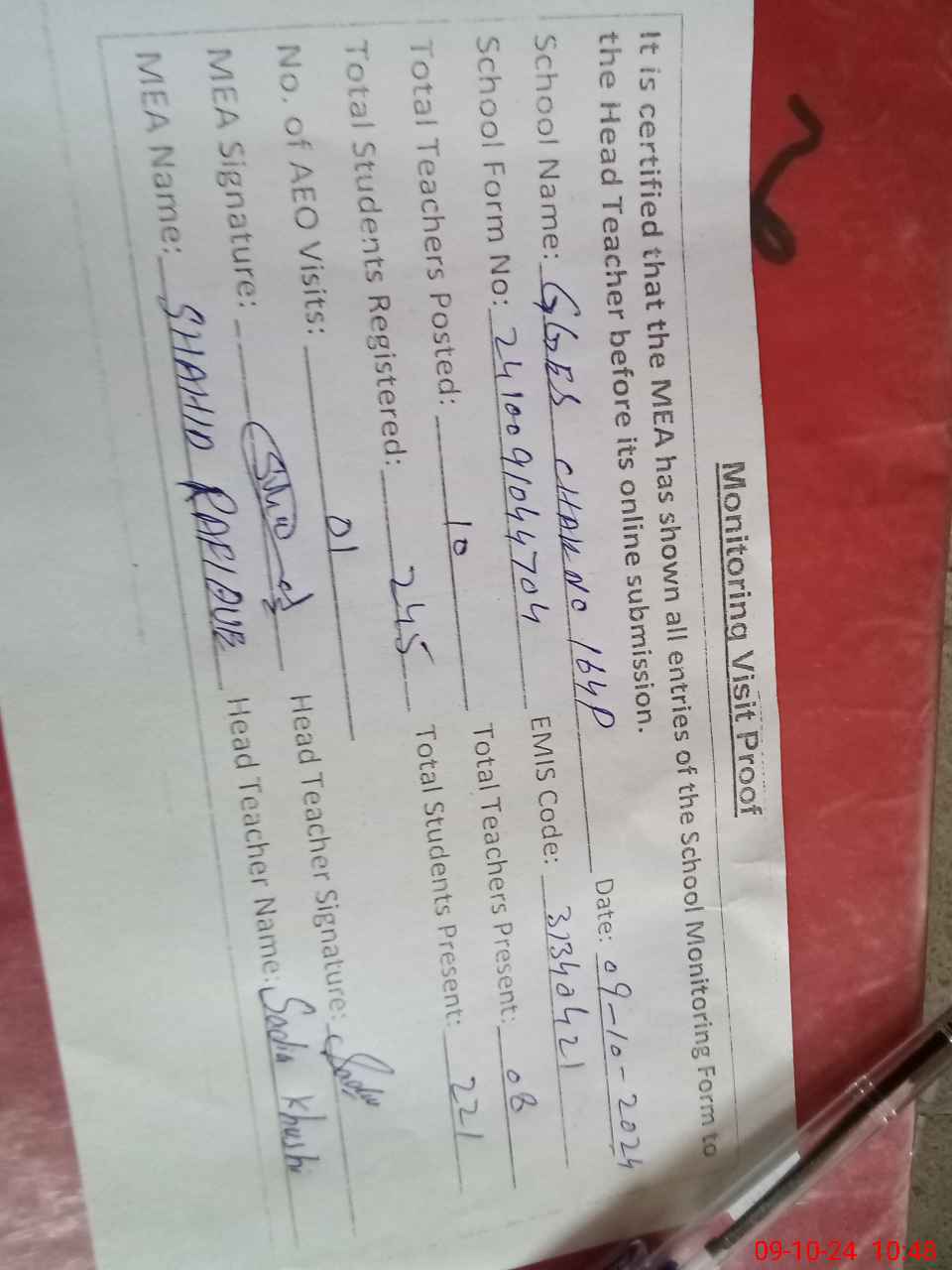 | Certified that this School was Inspected by the Undersigned MEA/DMO Today and the Information Stated Above is as Per Record. | |||||