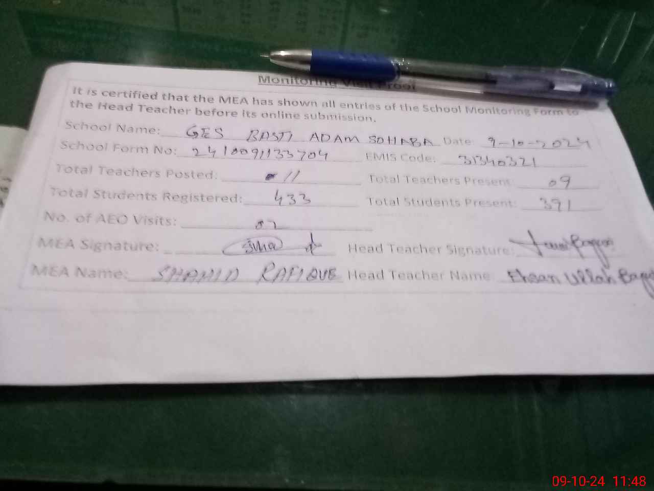 | Attendance Register | Head Teacher | MEA with School | Visit Proof |