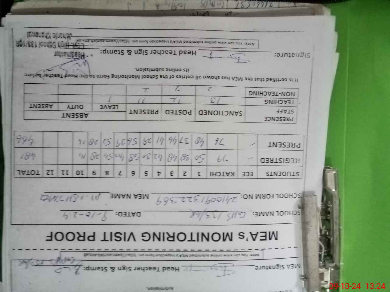 | Monitoring Date: 09-10-2024 | Start Time: 09-10-2024 12:58 PM | End Time: 09-10-2024 01:27 PM | Name of MEA: M.Is**** (S**** 03**** | |