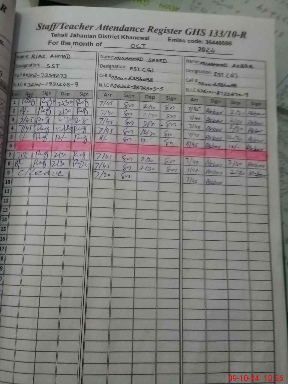 | CNIC | Full Name | Designation | R/C | Absence during last cal. month |