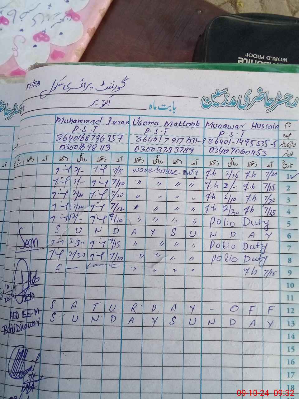 | Name: MU**** IM**** Designation: (School Headmaster's/Headmistress's) PST Phone/Cell Number: 03**** |