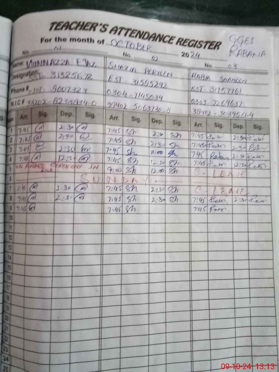 | CNIC | Full Name | Designation | R/C | Absence during last cal. month |