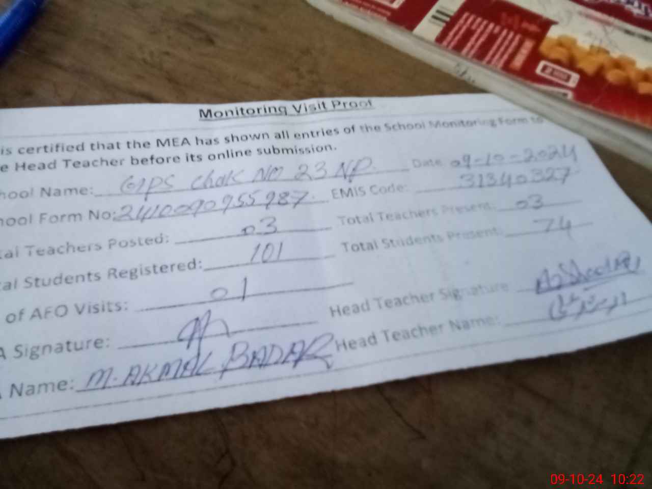 | EMIS Code: 31340327 | Name of School: GPS CHAK NO 23/NP | |||