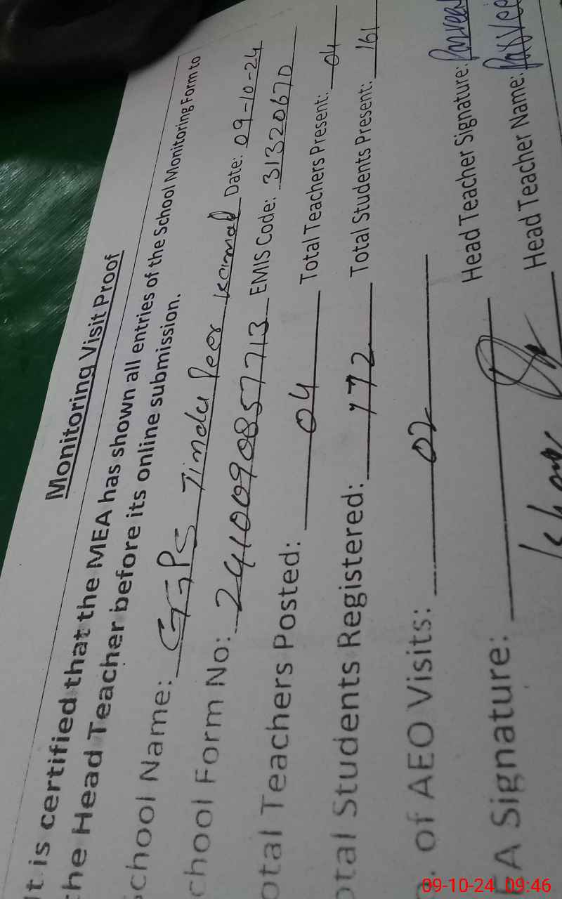 | Attendance Register | Head Teacher | MEA with School | Visit Proof |