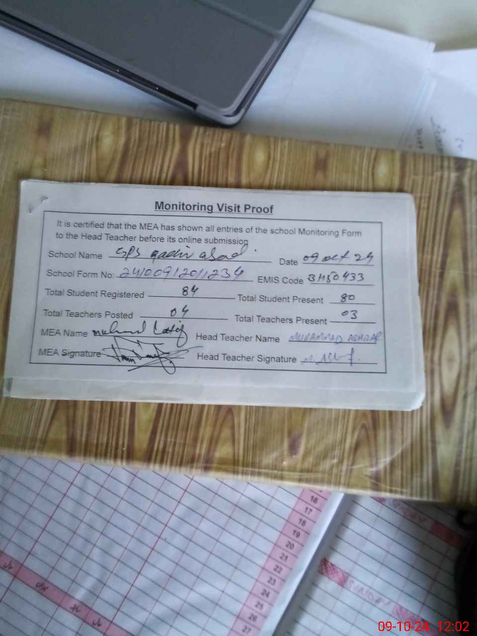 | Attendance Register | Head Teacher | MEA with School | Visit Proof |