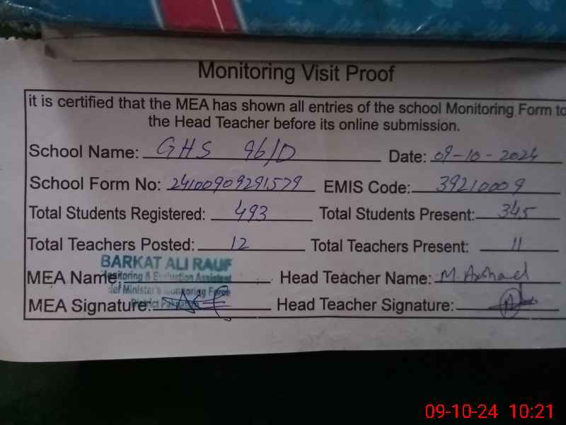| EMIS Code: 39210009 | Name of School: GHS CHAK NO. 96/D | |||