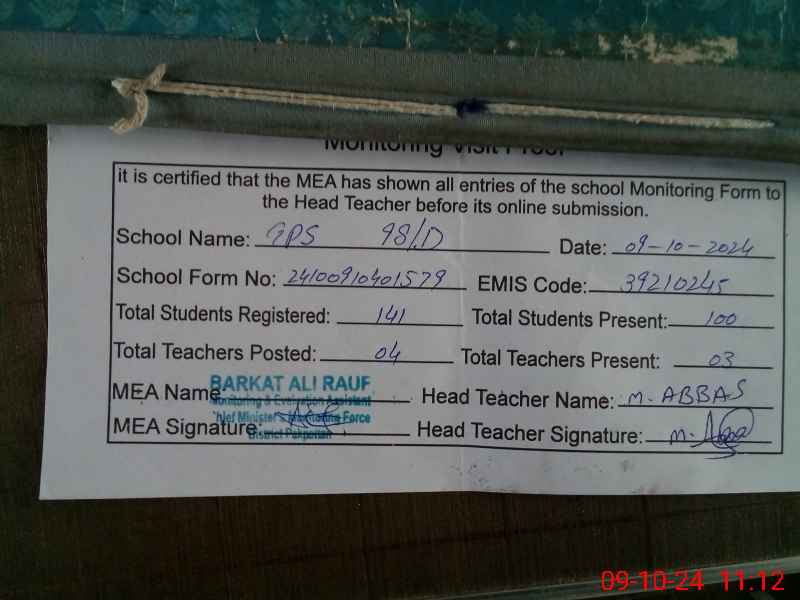 | EMIS Code: 39210245 | Name of School: GPS CHAK NO. 98/D | |||