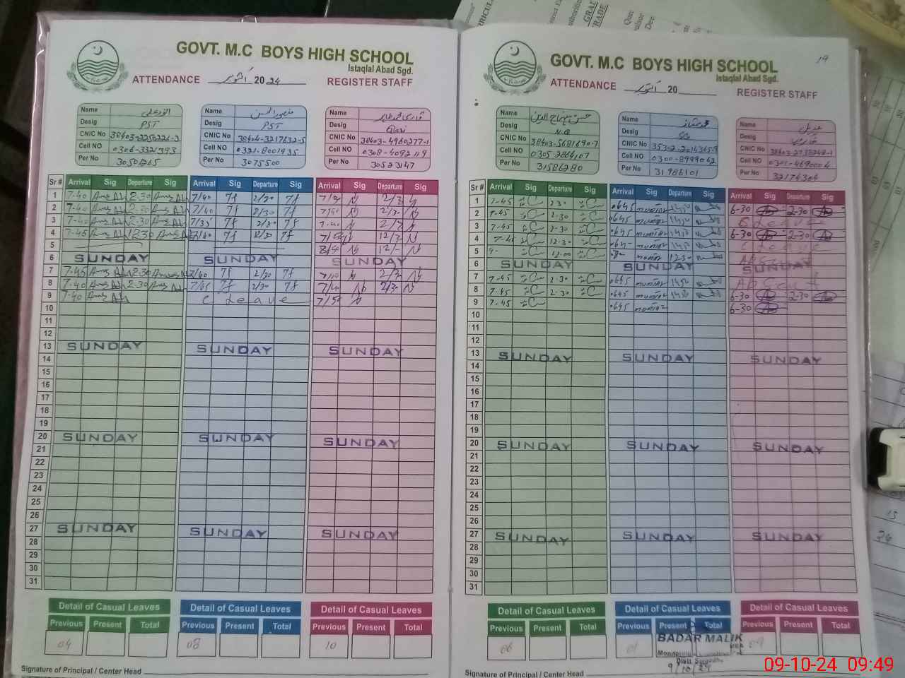 | CNIC | Full Name | Designation | R/C | Absence during last cal. month |
