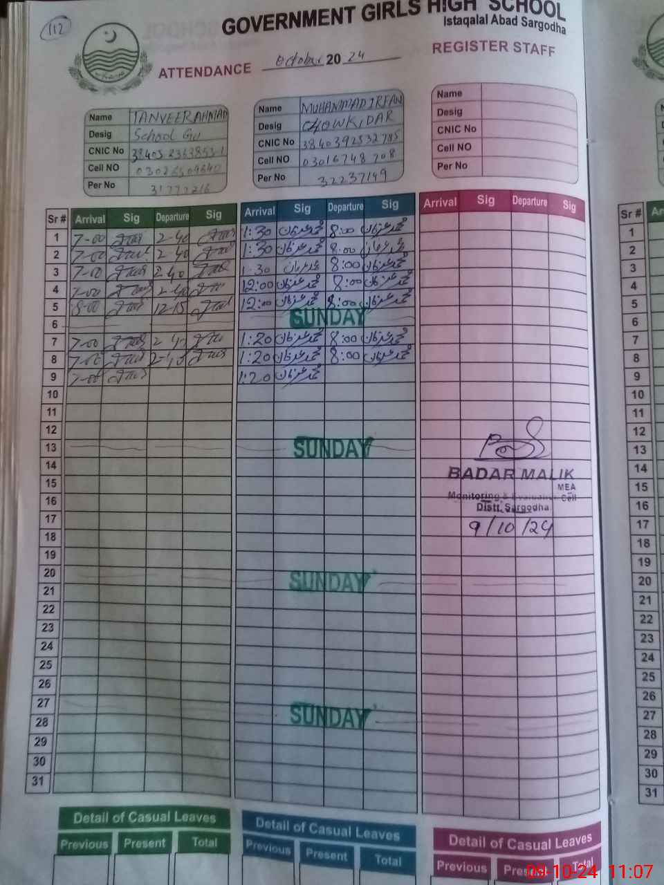 | CNIC | Full Name | Designation | R/C | Absence During Last Calender Month |