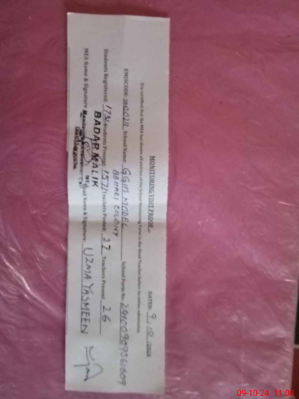| Monitoring Date: 09-10-2024 | Start Time: 09-10-2024 09:56 AM | End Time: 09-10-2024 11:09 AM | Name of MEA: BA**** MU**** | |