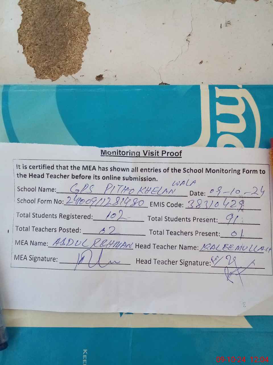 | Attendance Register | Head Teacher | MEA with School | Visit Proof |