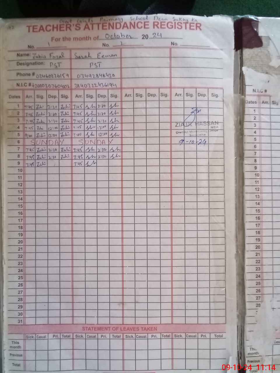 | Name: ZO**** FA**** Designation: (School Headmaster's/Headmistress's) PST Phone/Cell Number: 03**** |
