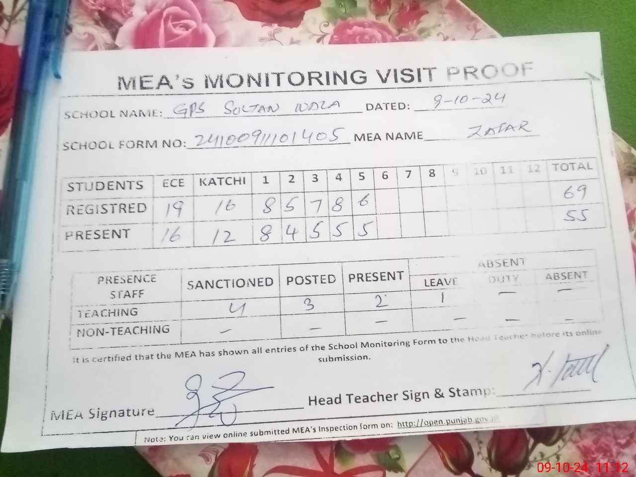 | Attendance Register | Head Teacher | MEA with School | Visit Proof |
