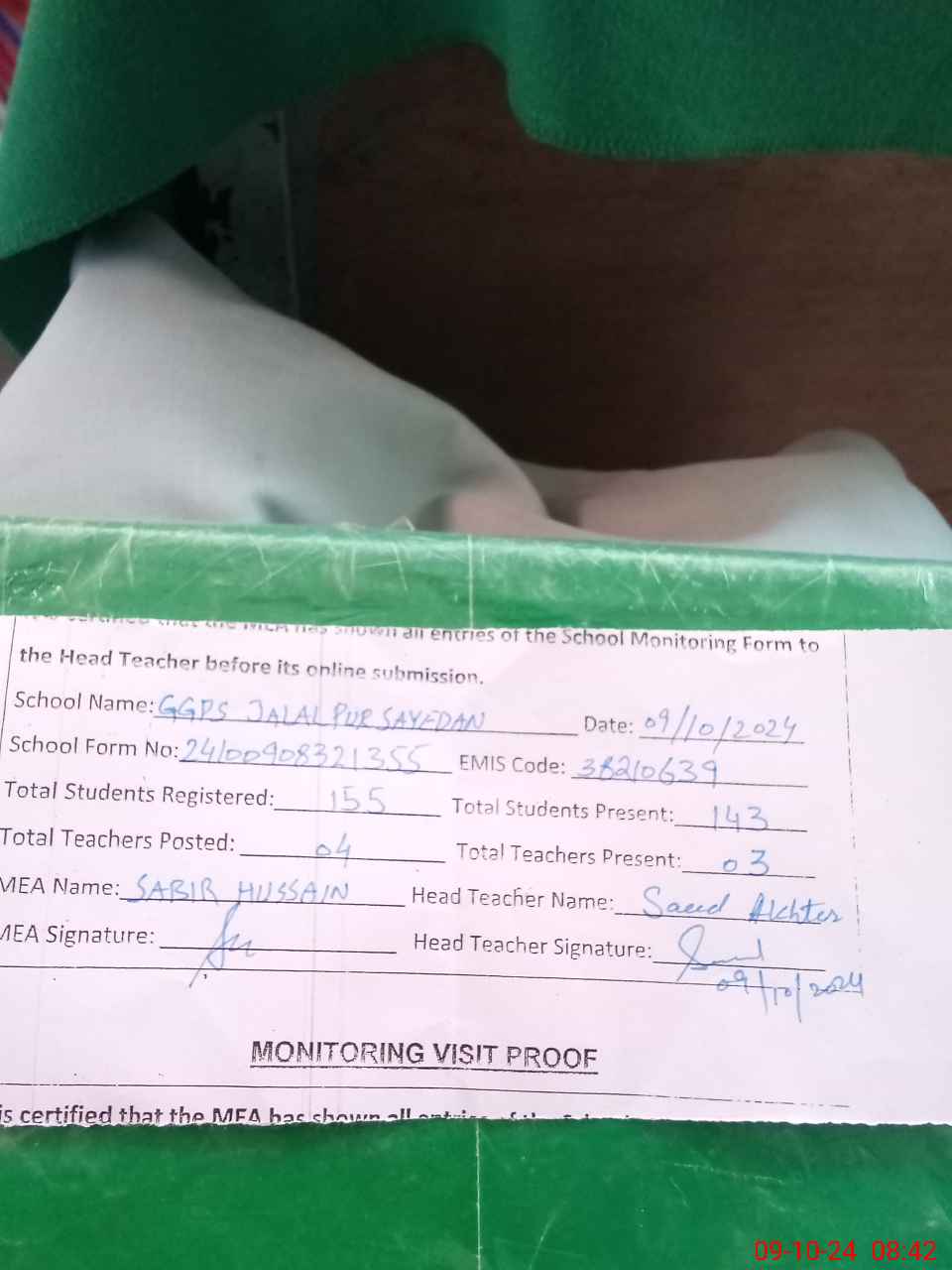 | Attendance Register | Head Teacher | MEA with School | Visit Proof |