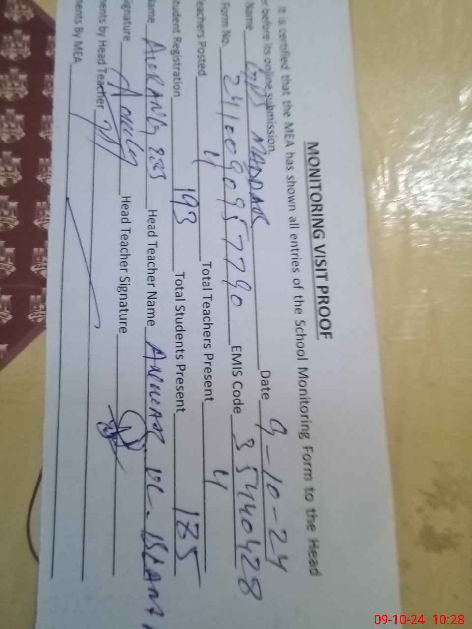 | Attendance Register | Head Teacher | MEA with School | Visit Proof |