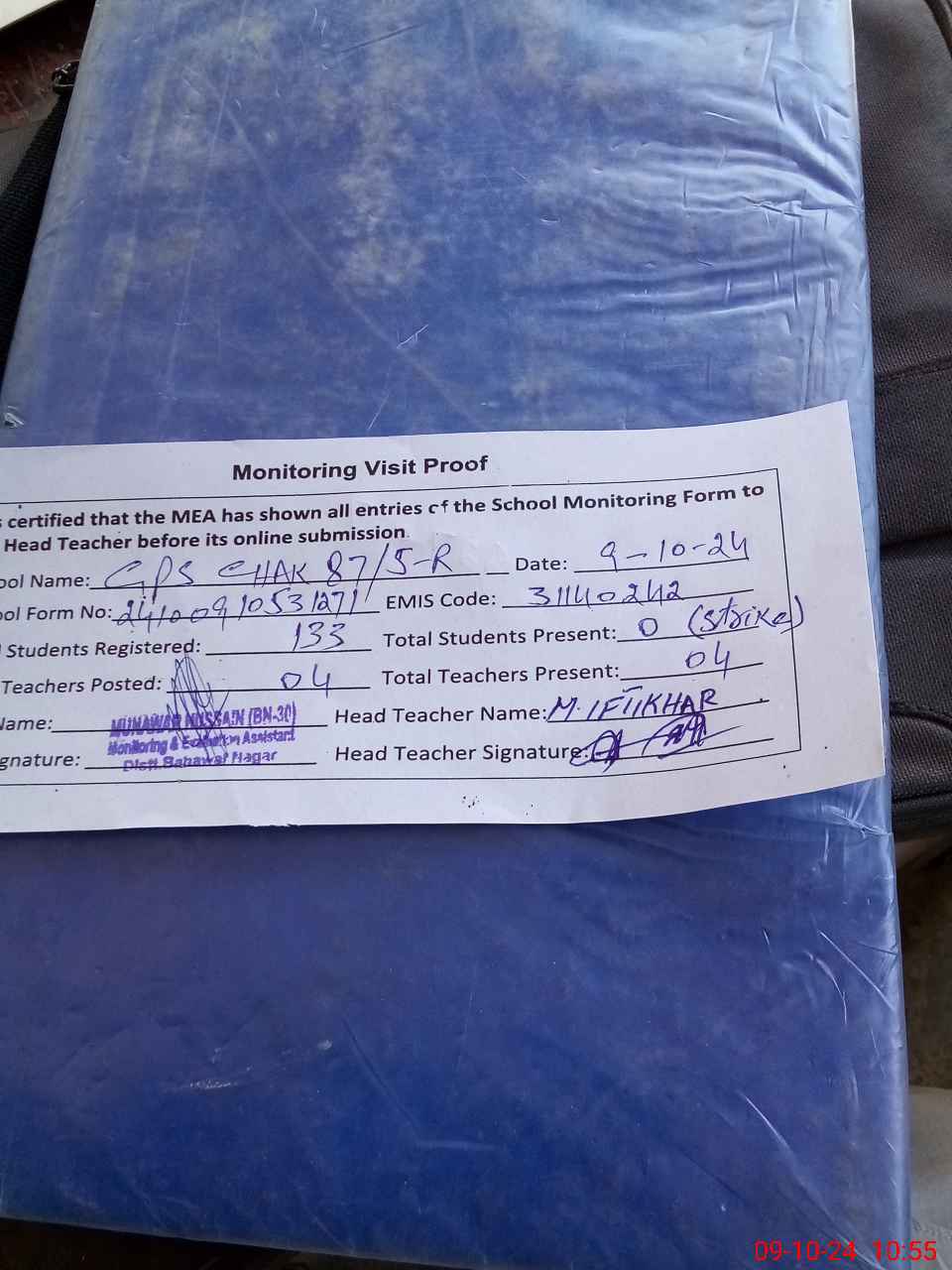 | Attendance Register | Head Teacher | MEA with School | Visit Proof |