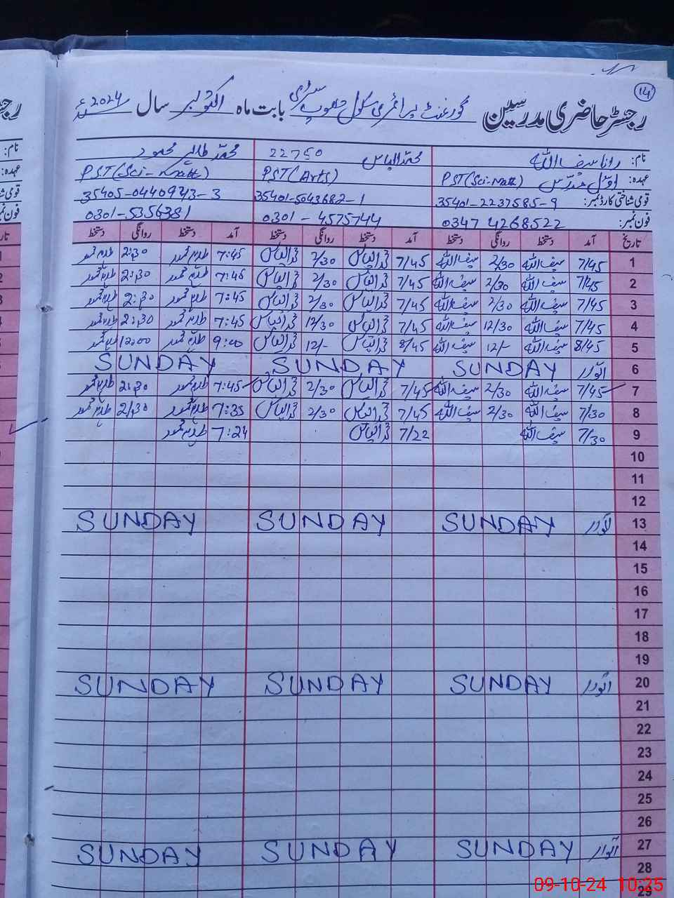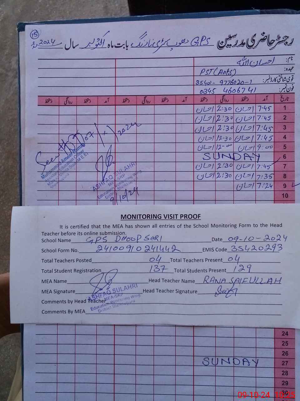 | Name: MIl**** Designation: (School Headmaster's/Headmistress's) PST Phone/Cell Number: 03**** |