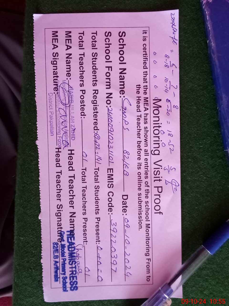 | EMIS Code: 39220397 | Name of School: GMPS 82/EB PO 66/EB ARIFWALA DISTT PAKPATTAN | |||