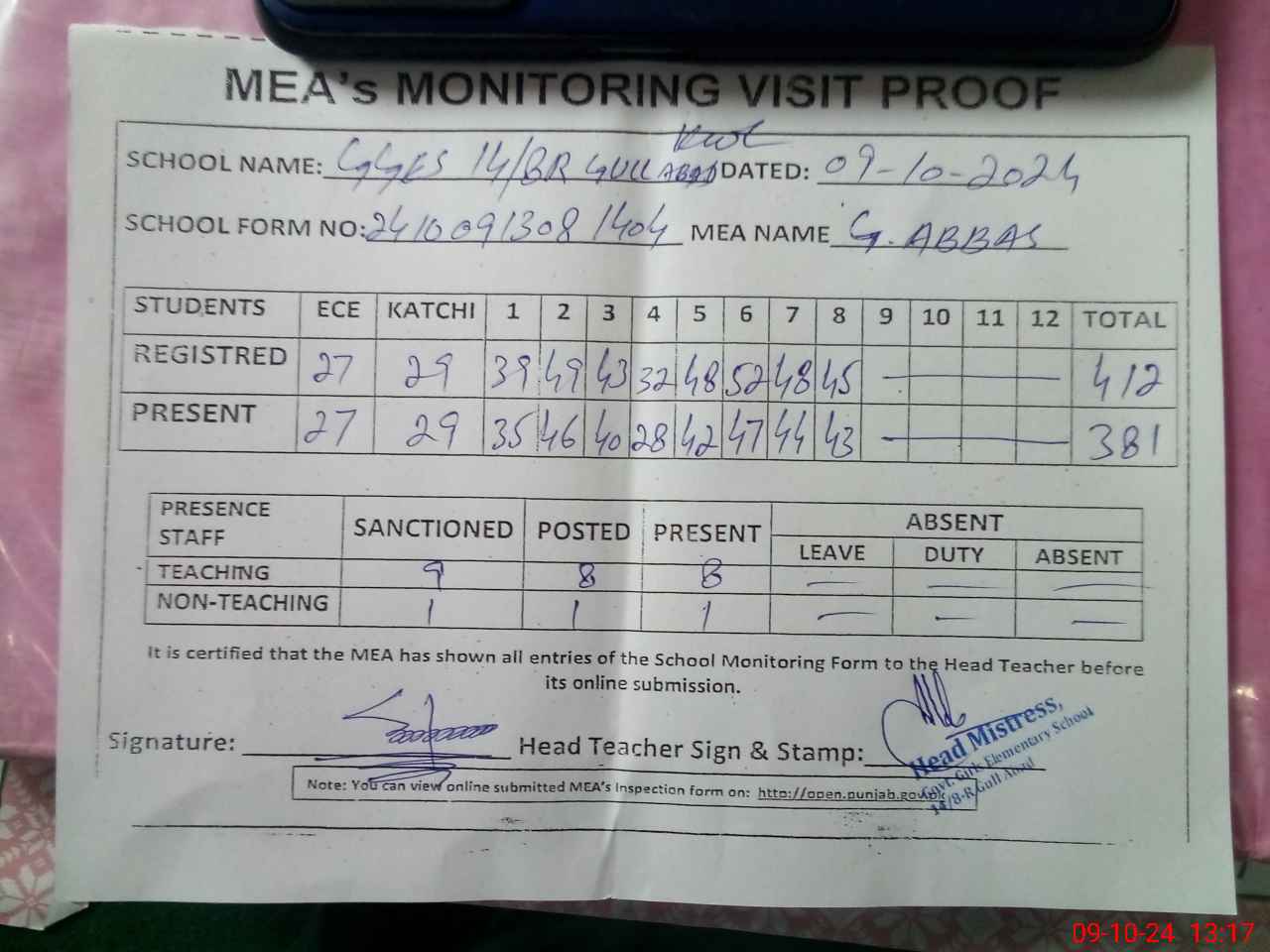 | Certified that this School was Inspected by the Undersigned MEA/DMO Today and the Information Stated Above is as Per Record. | |||||