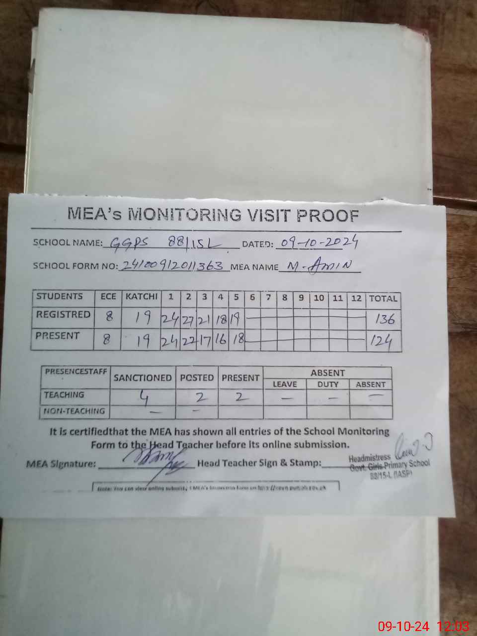 | Attendance Register | Head Teacher | MEA with School | Visit Proof |