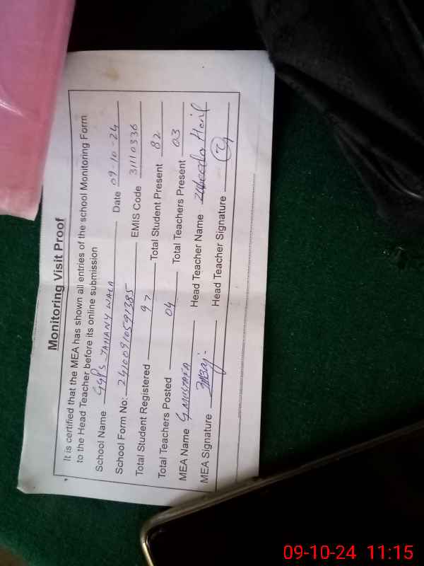 | Attendance Register | Head Teacher | MEA with School | Visit Proof |