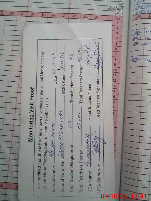 | Attendance Register | Head Teacher | MEA with School | Visit Proof |