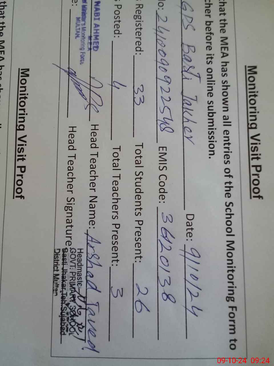 | Certified that this School was Inspected by the Undersigned MEA/DMO Today and the Information Stated Above is as Per Record. | |||||