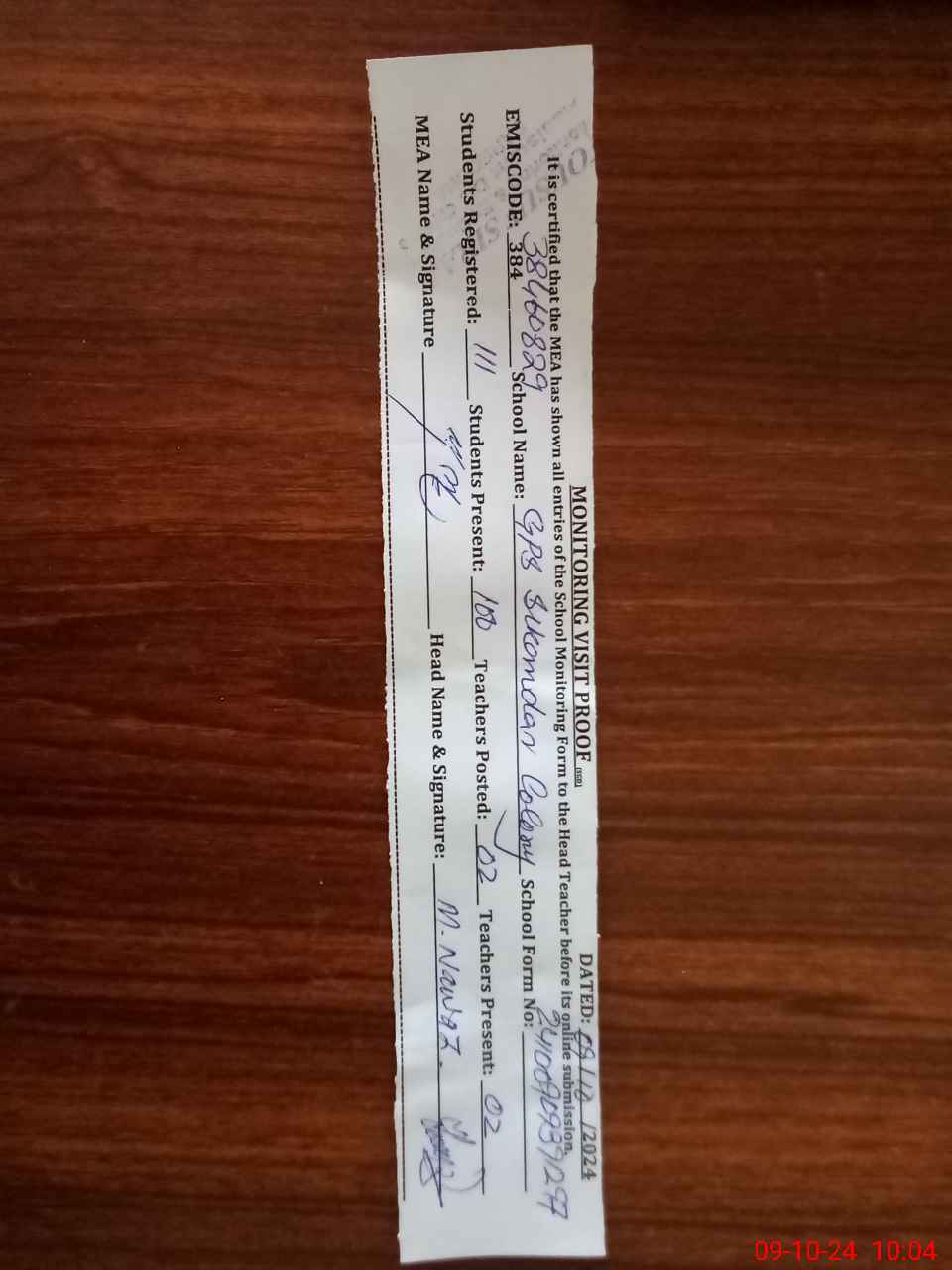 | Certified that this School was Inspected by the Undersigned MEA/DMO Today and the Information Stated Above is as Per Record. | |||||