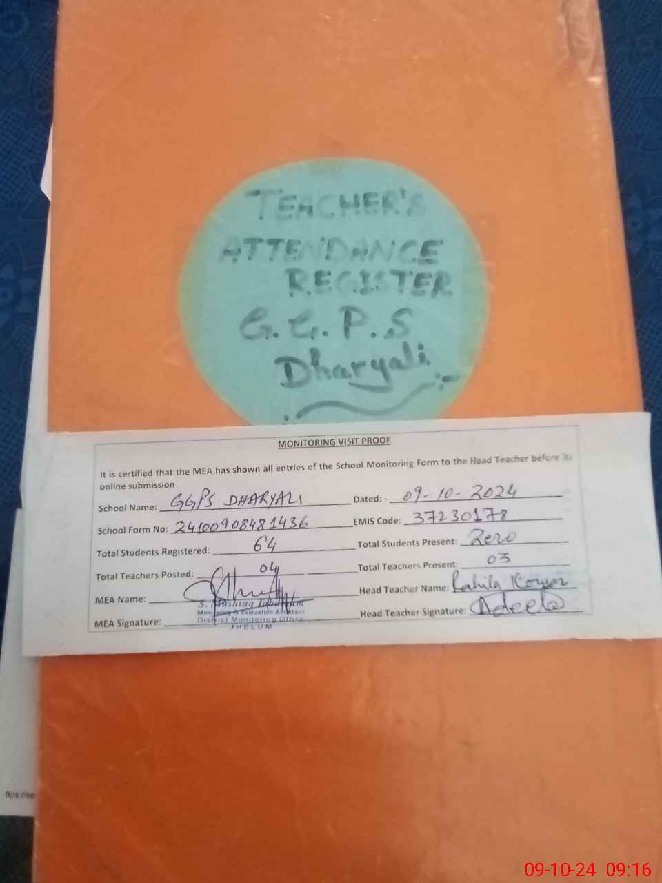 | Attendance Register | Head Teacher | MEA with School | Visit Proof |