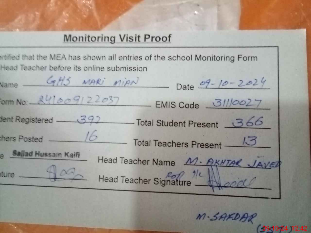 | EMIS Code: 31110027 | Name of School: GHS MARI MAIN SAHIB | |||