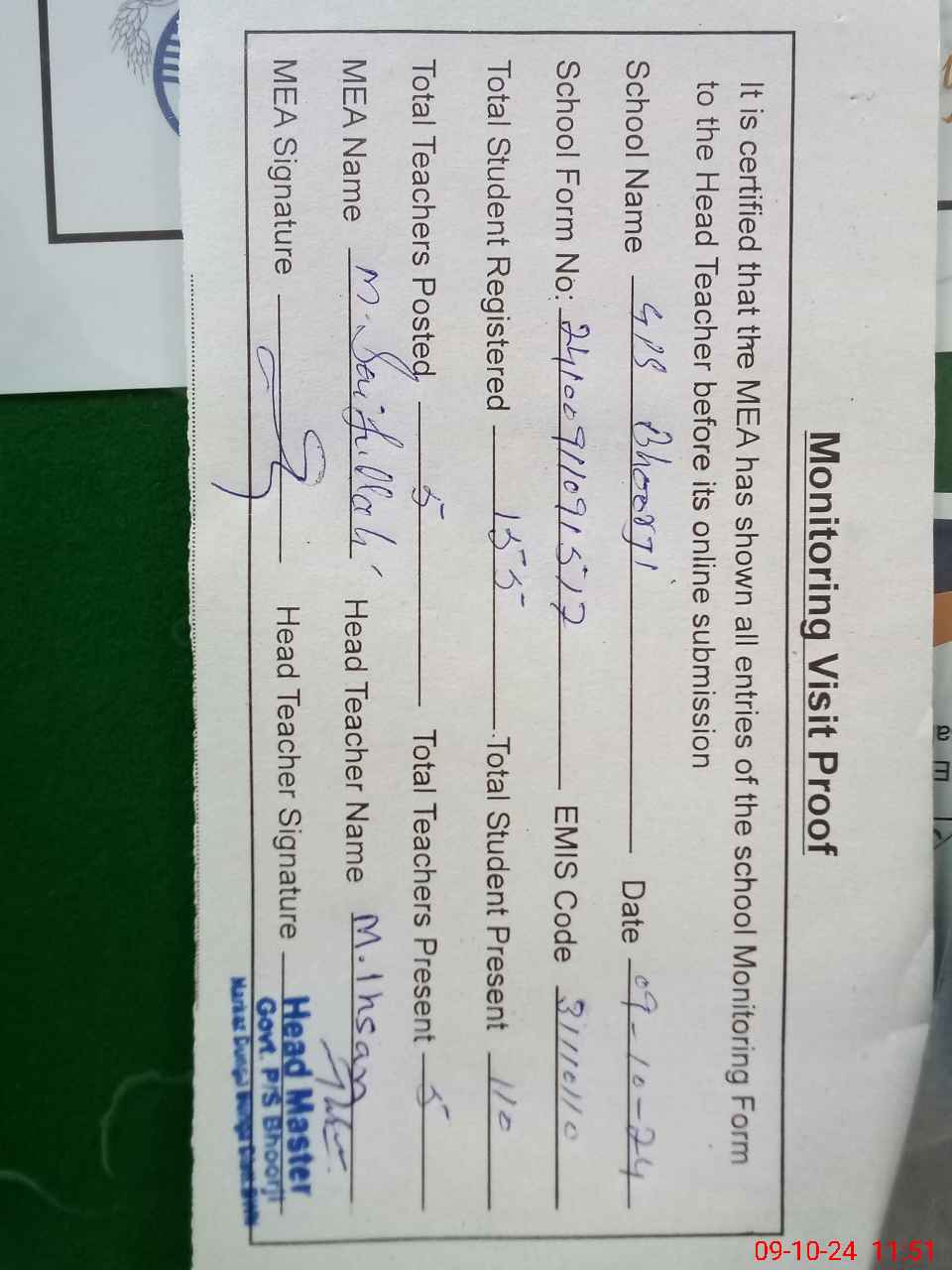 | Certified that this School was Inspected by the Undersigned MEA/DMO Today and the Information Stated Above is as Per Record. | |||||