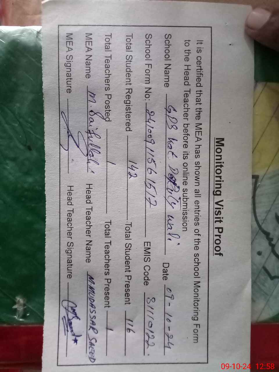 | Attendance Register | Head Teacher | MEA with School | Visit Proof |