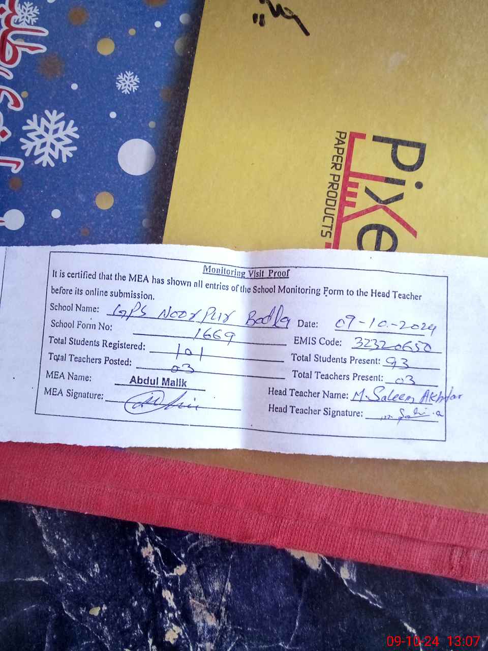| Attendance Register | Head Teacher | MEA with School | Visit Proof |