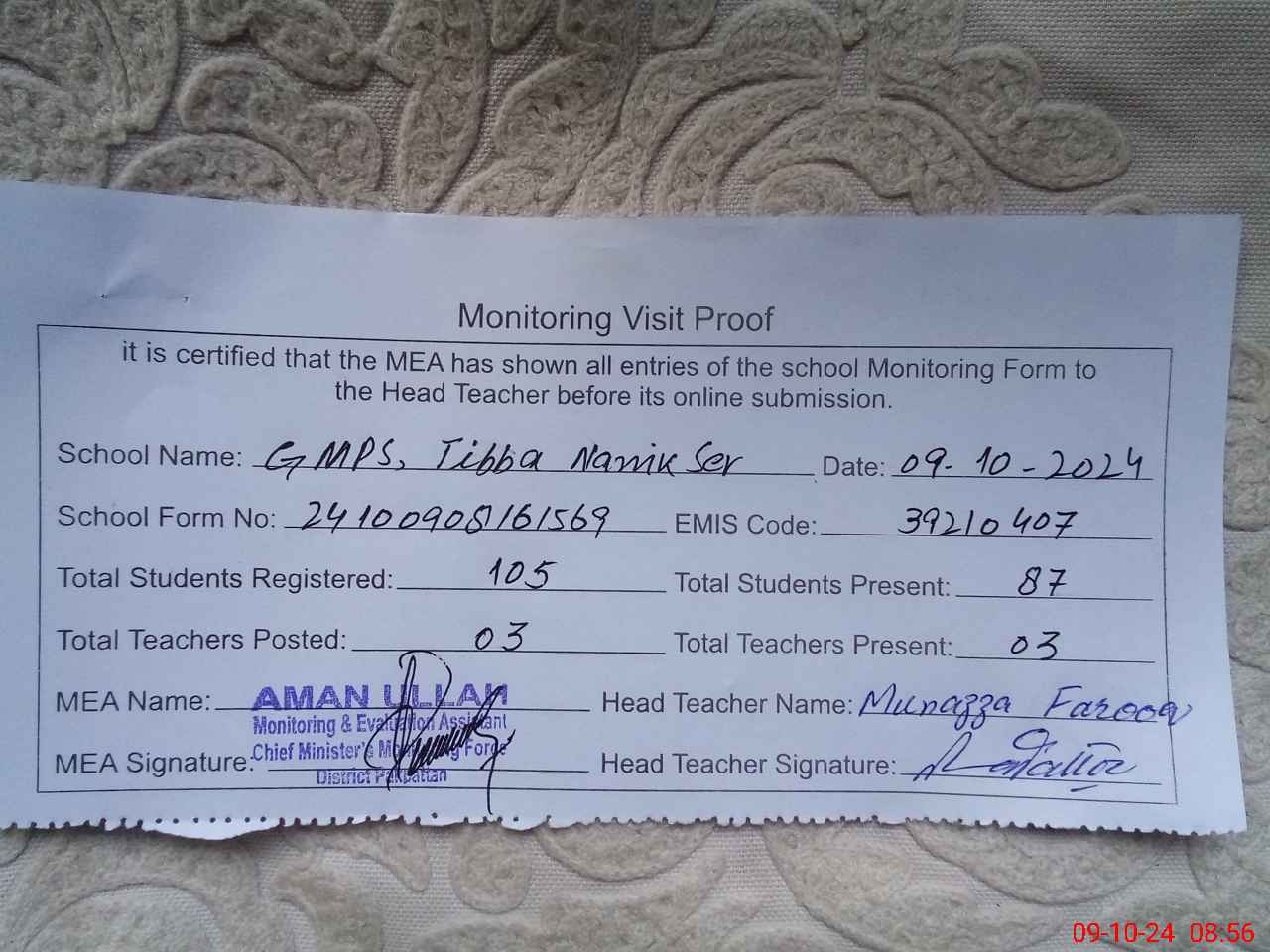 | Attendance Register | Head Teacher | MEA with School | Visit Proof |