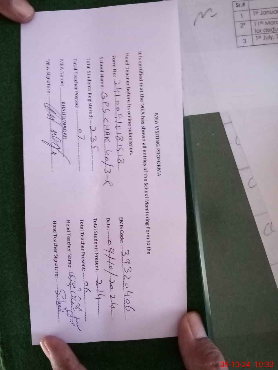 | Certified that this School was Inspected by the Undersigned MEA/DMO Today and the Information Stated Above is as Per Record. | |||||