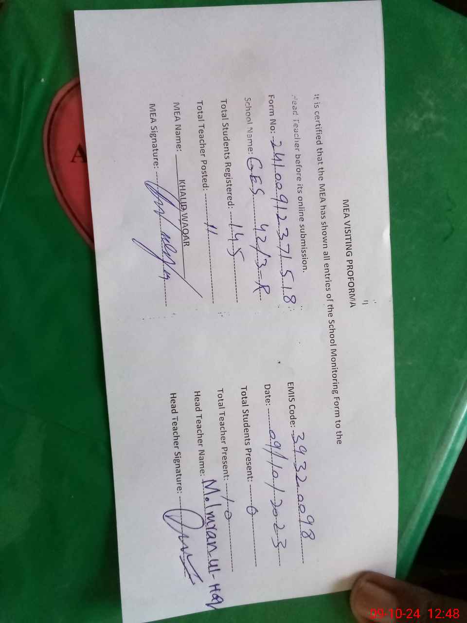 | Certified that this School was Inspected by the Undersigned MEA/DMO Today and the Information Stated Above is as Per Record. | |||||